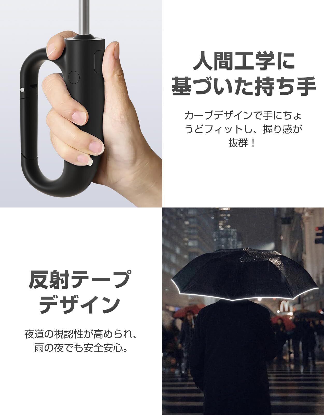 【濡れない逆折り式傘】従来の折りたたみ傘は閉じるときに濡れた部分が外側になりがちですが、逆折り式傘では閉じるときに濡れた面が内側になるので、洋服や荷物を濡らす心配がありません。また、周囲の人にも迷惑をかけることがありません。【安全性を高める反射テープデザイン】傘の裾部分に反射生地を使用しているため、夜間でも視認性が高まり、雨の夜でも安全安心にご使用いただけます。
