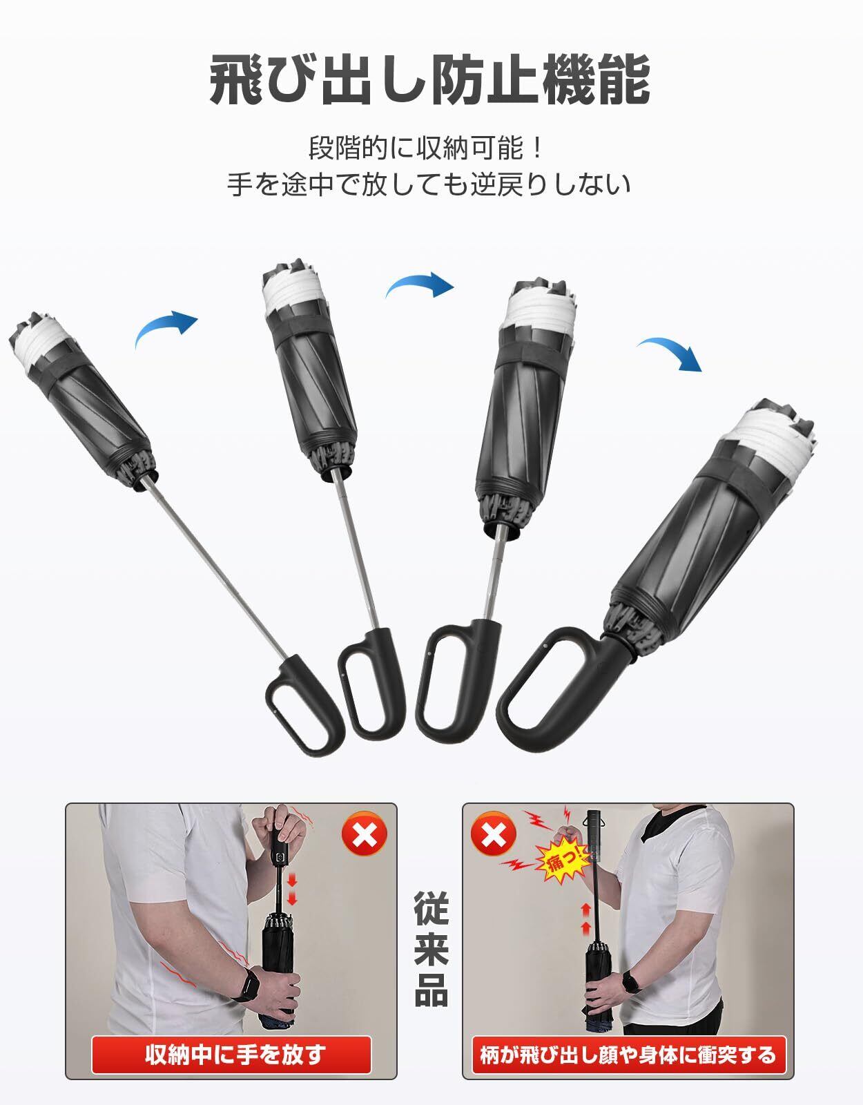 【飛び出し防止安全式折り畳み傘】ジャンプ式折りたたみ傘の中には、手元を収納する際に手を離すと手元が飛び出し、顔や身体に衝突するという心配があります。しかし、SHISHAMO自動開閉式傘には逆戻り防止装置が内蔵されています。そのため、手元を収納する途中で手を離しても、手元が飛び出すことなく安全に止まります。一般的な自動開閉折りたたみ傘よりも安全性が向上しており、両腕の力だけで仕舞うことができるため、男性はもちろん、女性やご年配の方でも操作しやすくなります。