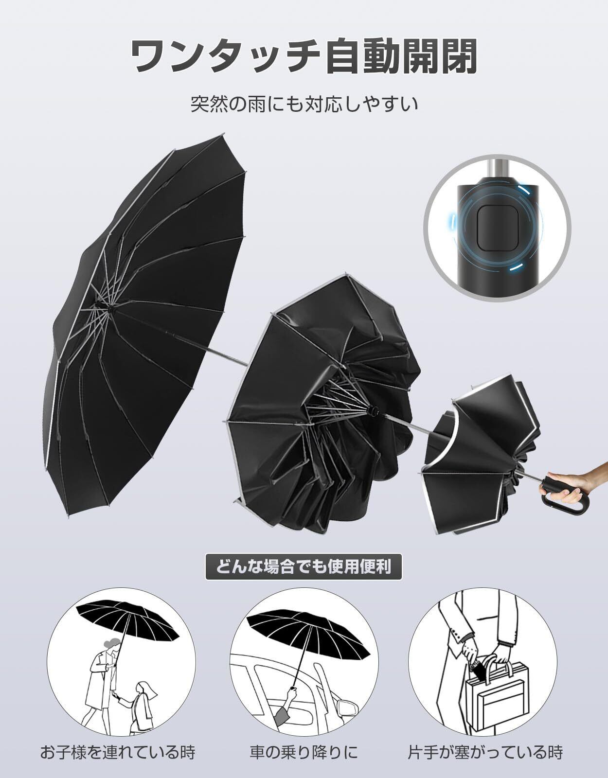 【ワンタッチ自動開閉傘】この自動開閉式の傘は、片手がふさがっているときでも、ボタンをワンタッチするだけで素早く開閉できます。急な雨に見舞われたときや、車の乗降時など、さまざまな場面で便利です。子育て中の方や通勤時に頻繁に傘を使う方にもおすすめです。