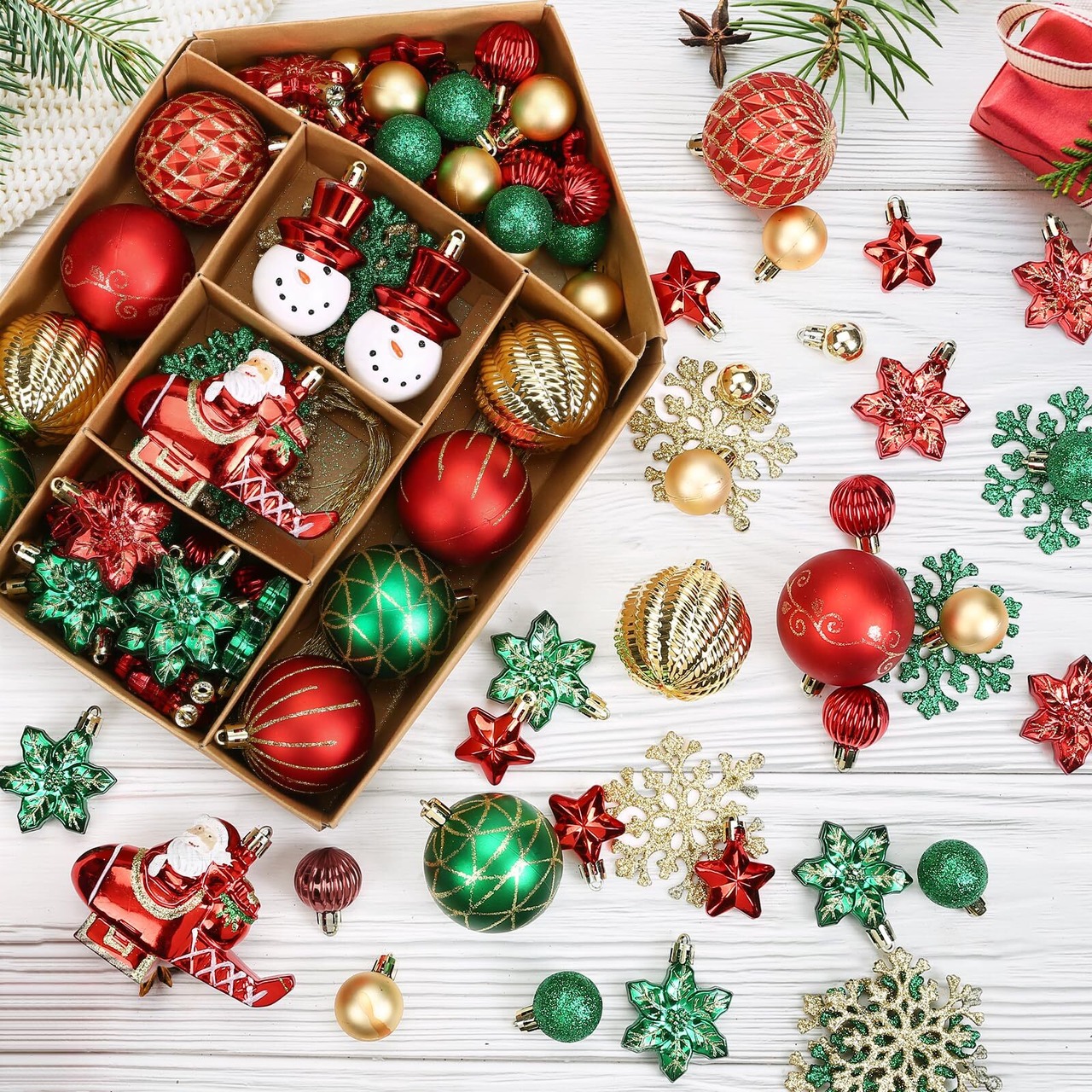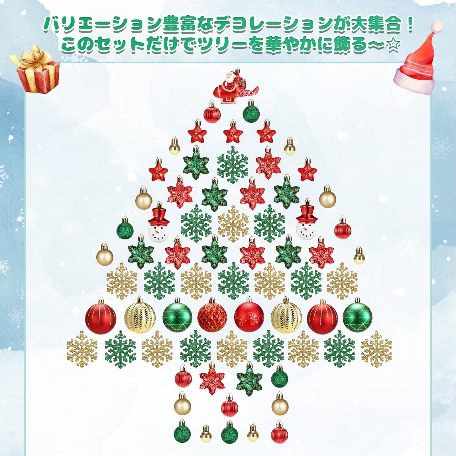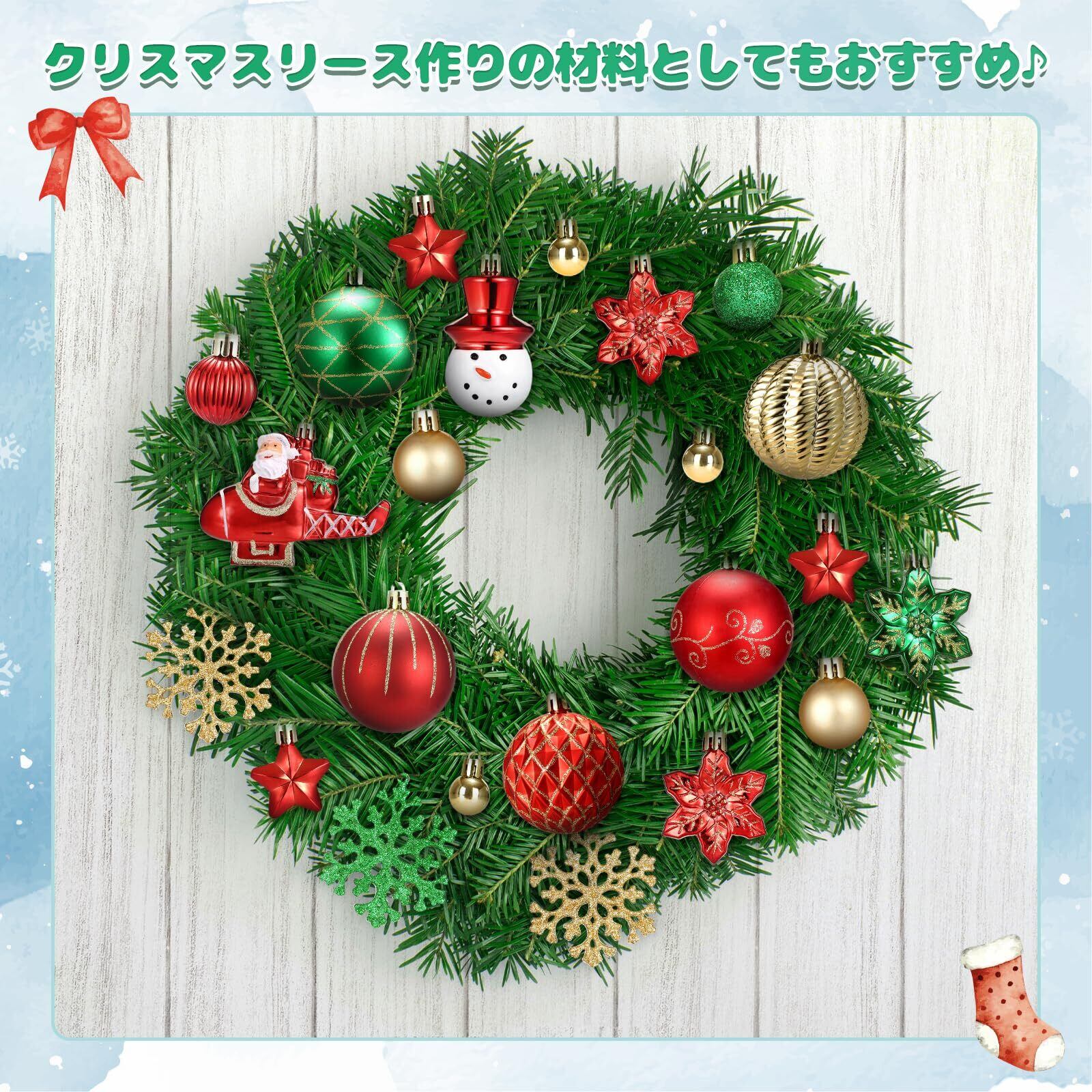 【種類豊富】オーナメントボール、スノー・雪だるま・サンタ、雪の結晶の形をした、クリスマスポップなオーナメントがいっぱい詰め合わせたセット!形のバリエーションが豊富、存在感のあるオーナメント、楽にキレイで見栄えのよいクリスマスツリーが飾れます。