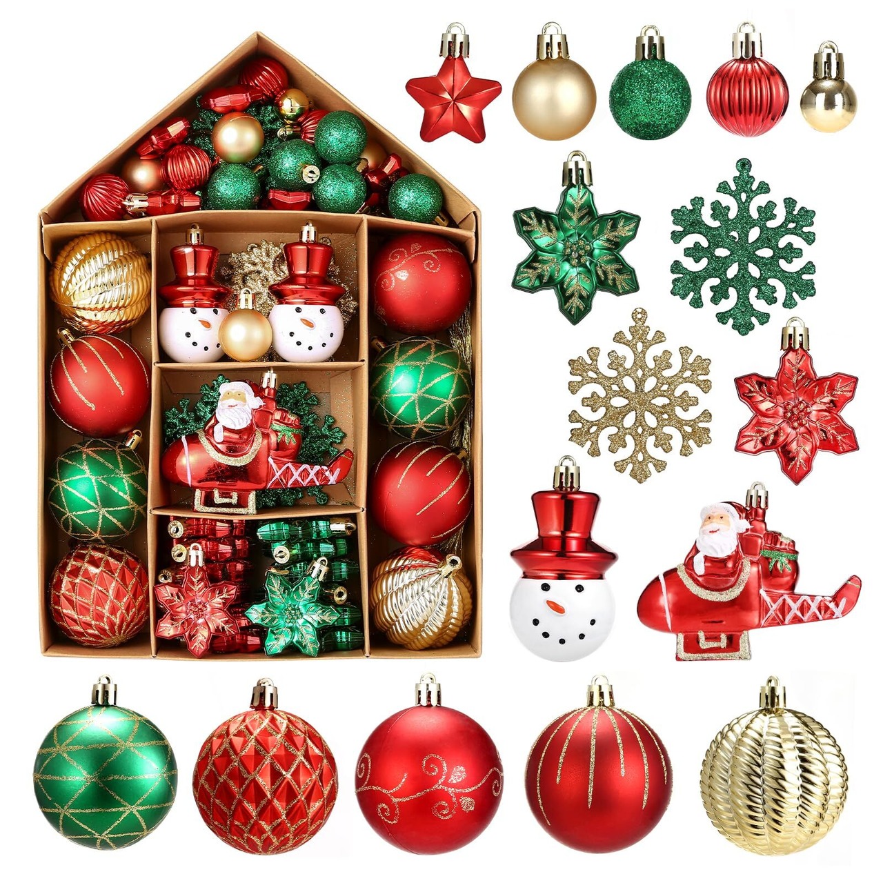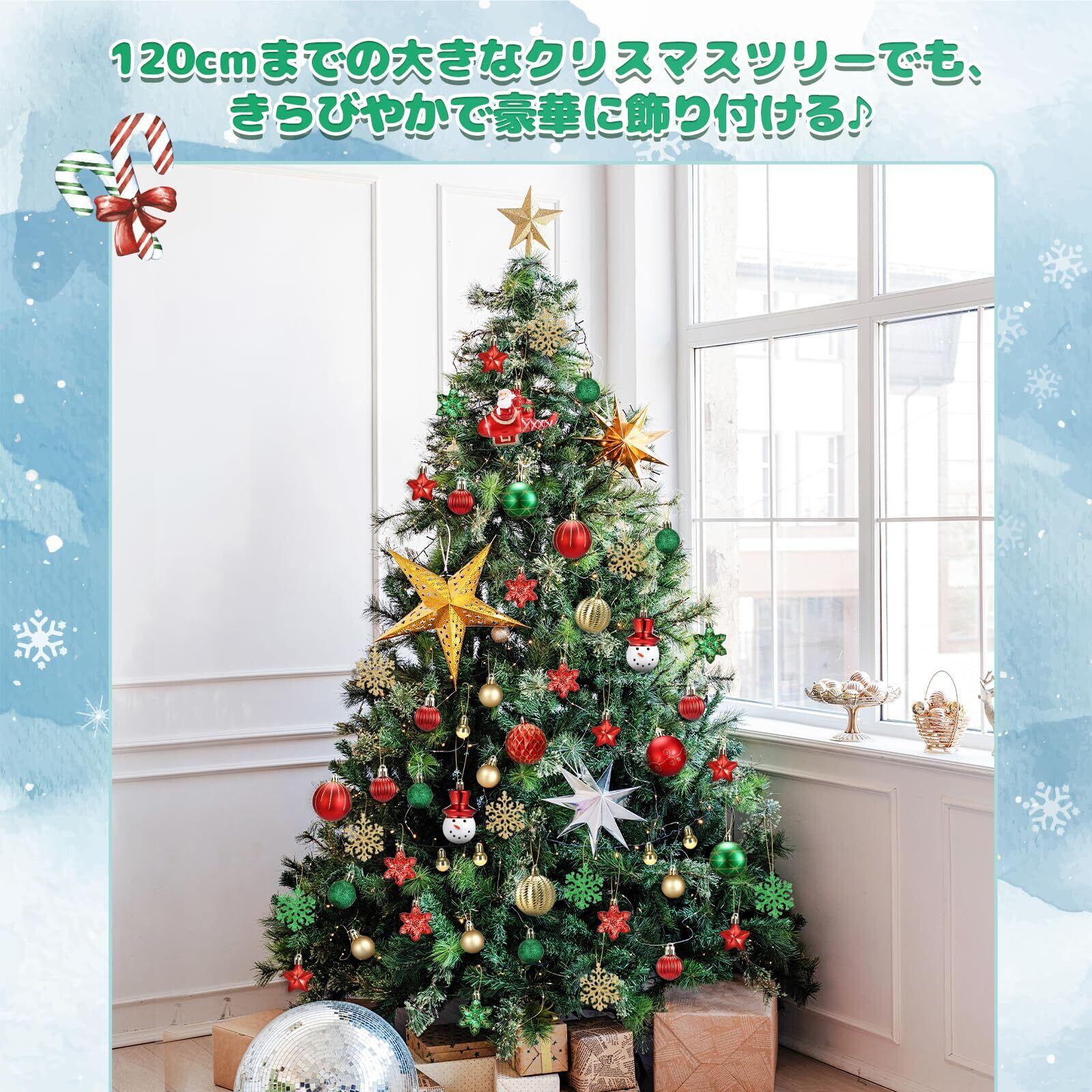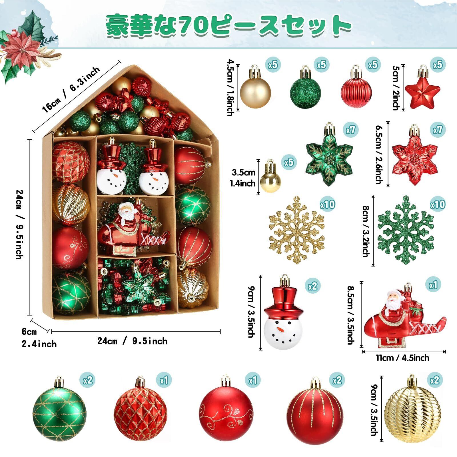 【大容量セット】入数:70個、サイズ:3㎝~8㎝、材質:プラスチック、カラー:赤&緑、このセットだけでクリスマスツリーをより華やかに演出します~