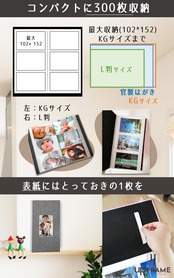 大容量な300枚収納。L版はもちろん、一般はがきやKGサイズまで格納できる102*152mmの収納ポケット 3段仕様で合計300枚格納できます