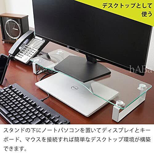 【優れた機能性!】hABaのモニタースタンドは、56cm×21cmのサイズで、キーボード収納スペースも完備。必要なものをすぐ手の届く場所に配置できるため、効率的な作業が可能です。また、強化ガラスを使用しているため、耐久性にも優れ、日々の使用にも安心です。