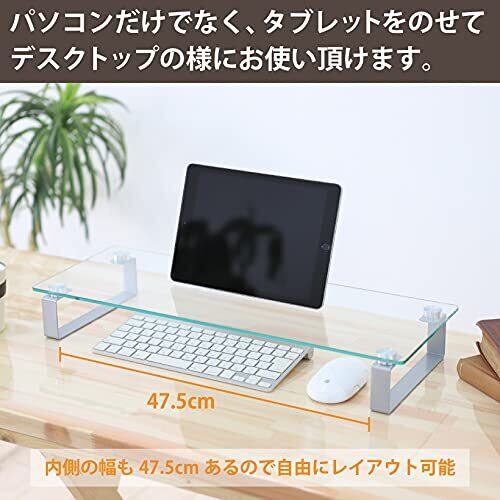 【多用途で活躍!】このスタンドは、モニターやノートPCだけでなく、プリンター台としても活用できるため、自宅やオフィスにぴったり。デスクを広々と使うことができ、常にクリーンで整理された印象を保てます。また、ガラス製のため、光を反射し、作業空間を明るく演出してくれます。