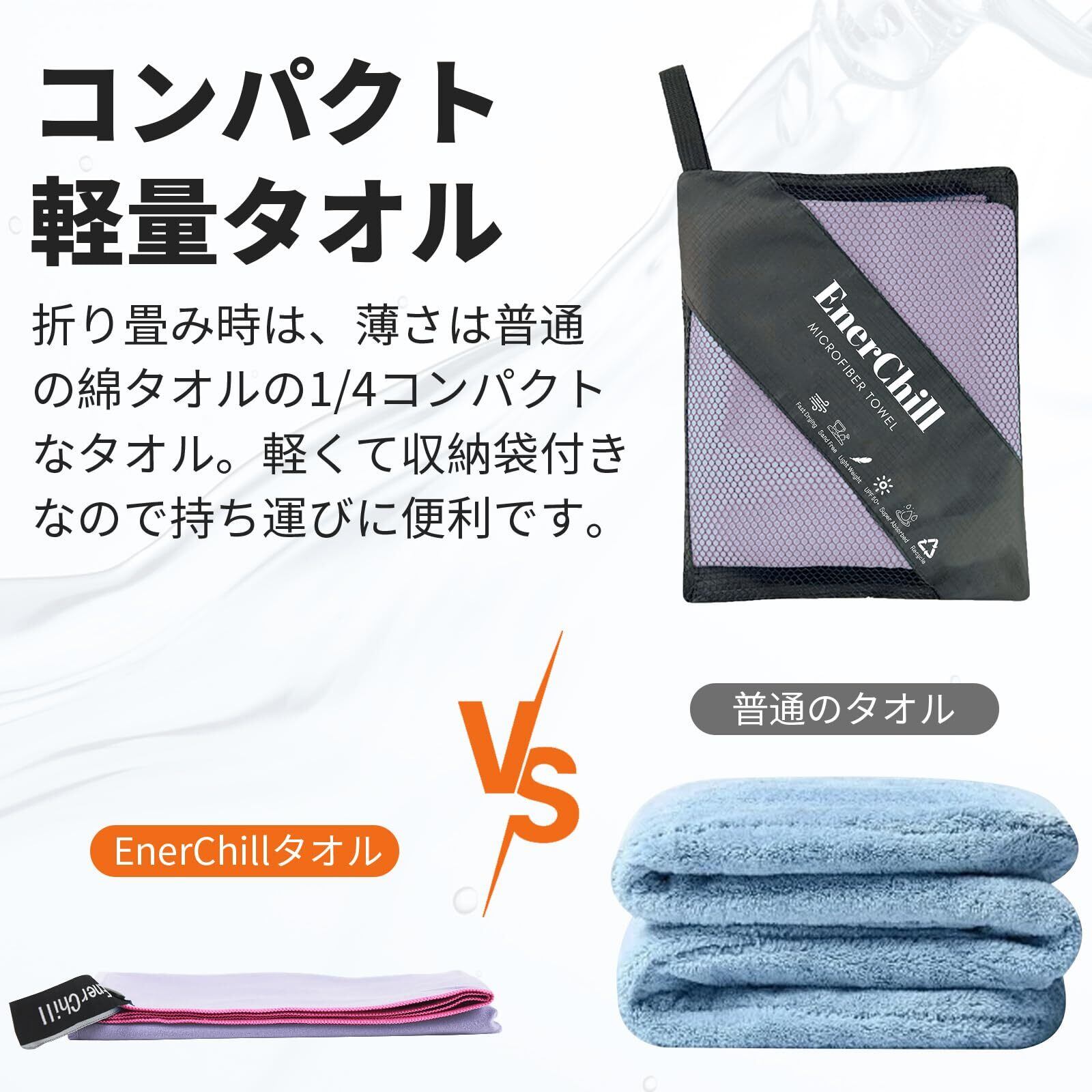 【コンパクト・軽量】折り畳み時は、薄さは普通の綿タオルの1/4コンパクトなタオル。軽くて収納袋付きなので持ち運びに便利です。