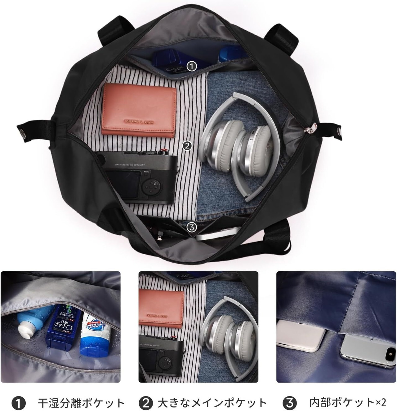 【乾湿分離で安心!】内部には乾湿分離ポケットを搭載しており、濡れたタオルや水着を他の荷物と分けて収納可能。おしゃれだけど実用的なデザインで、旅行やスポーツのシーンに最適です。