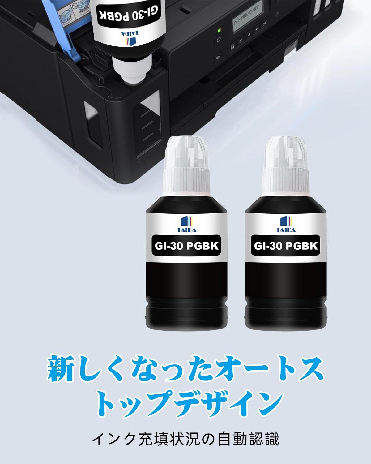 【製品特徴】TAIDAの GI-30PGBK 互換インクボトル:増量タイプ、高品質、高発色で経済的な互換インクボトルです。※こちらは純正品ではありません。純正インクと同時に使用可能です。インクの注ぎ口は純正品と同じように、そのままプリンターに差し込んで使用することが可能です