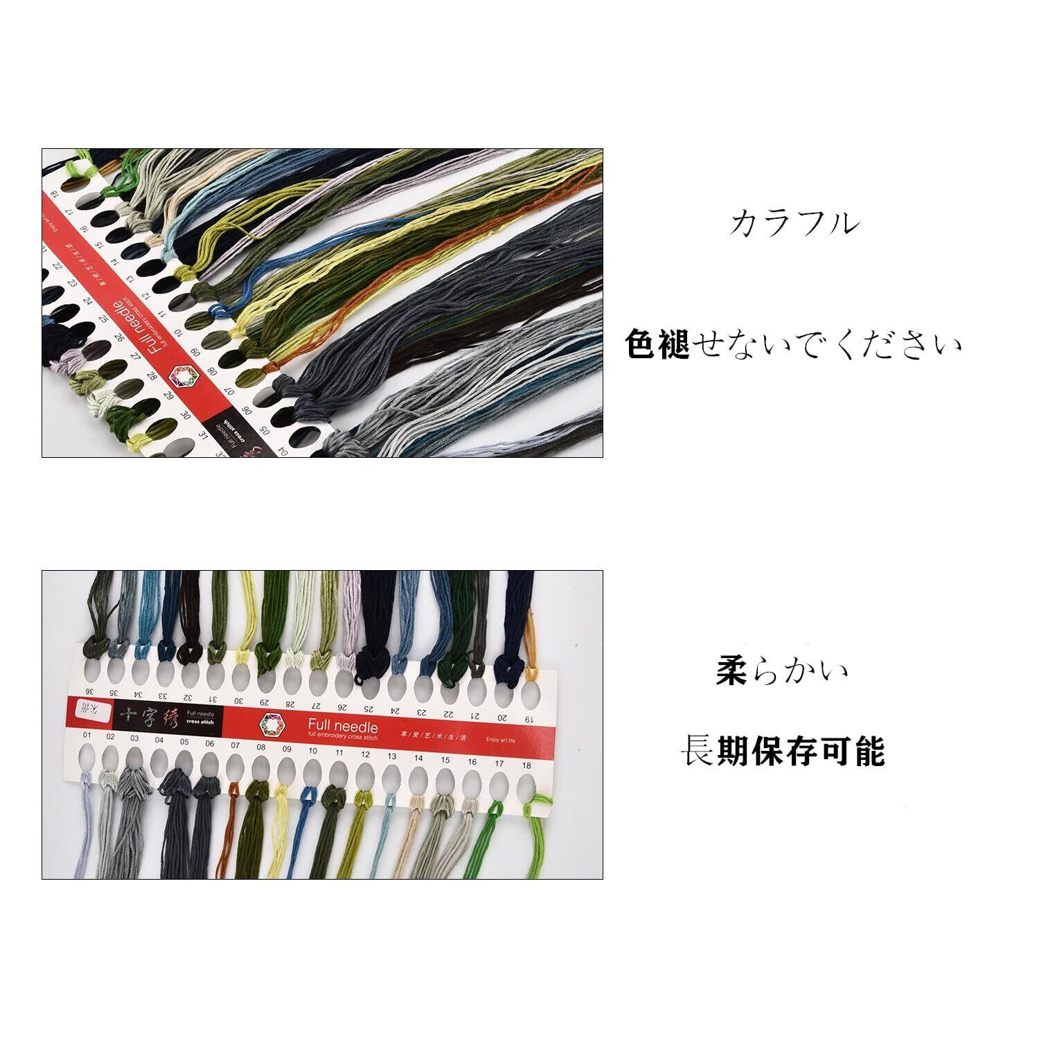 【厳選された素材】刺繍糸は天然コットンで作られ、滑らかな質感と柔らかい肌触りを兼ね備えます。丈夫で耐久性に優れ、色あせや色落ちもしにくく、長くご愛用いただけます。また、豊かな発色と美しい光沢により微妙な色合いの変化を表現し、明るい雰囲気を演出してくれます。さらに、無毒の洗える染料で染められ、子供やペットがいるご家庭でも安心にご利用いただけます