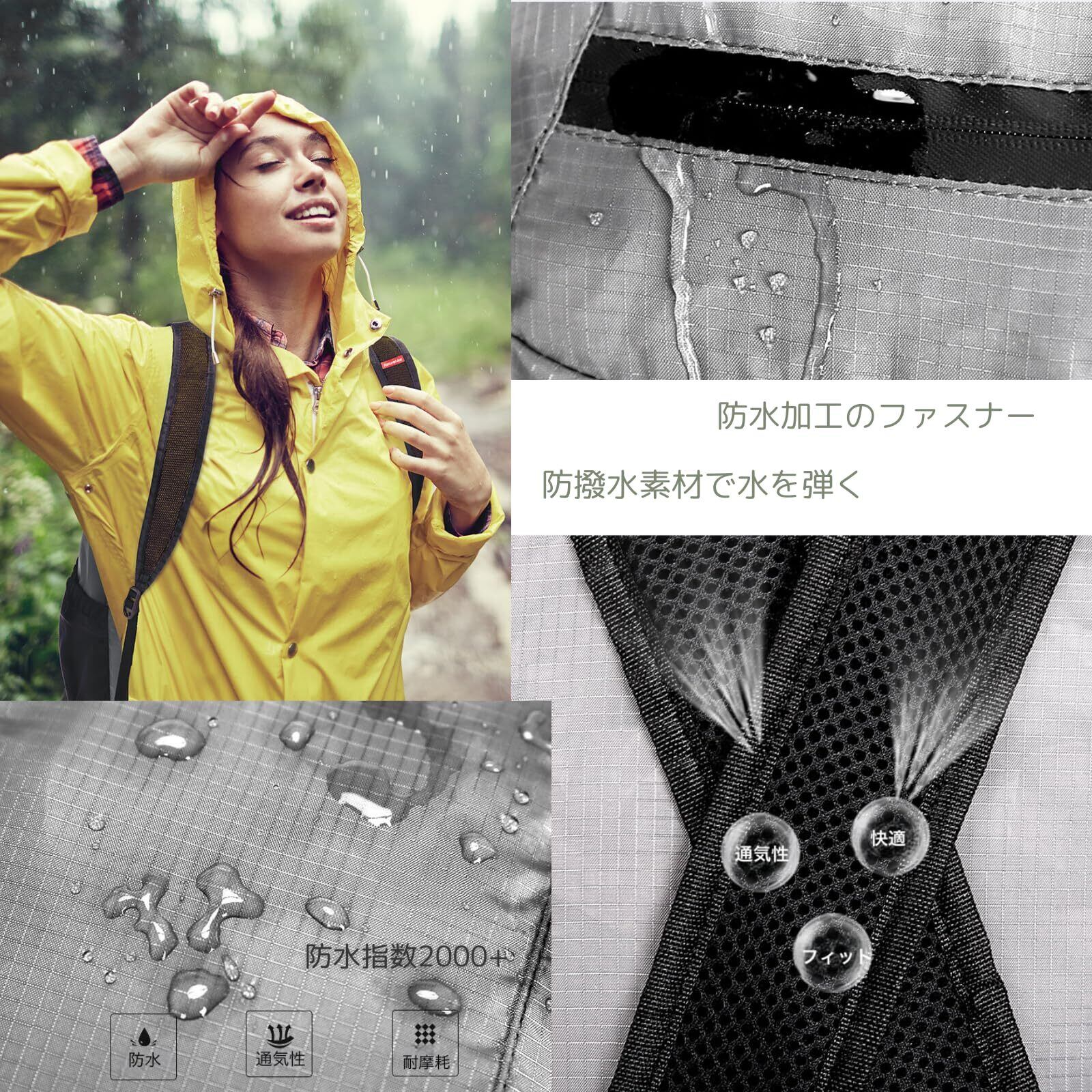 【通気性・防水性】防撥水ポリエステル素材を採用していて、リュックサックの全体防水指数は2000+。ファスナー部分にもYKK防水ファスナーを採用しており、ファスナーの隙間から雨水が浸透しないようになっています。背面と肩ベルトにメッシュ素材を使用し、通気性が良く蒸れにくい設計です。