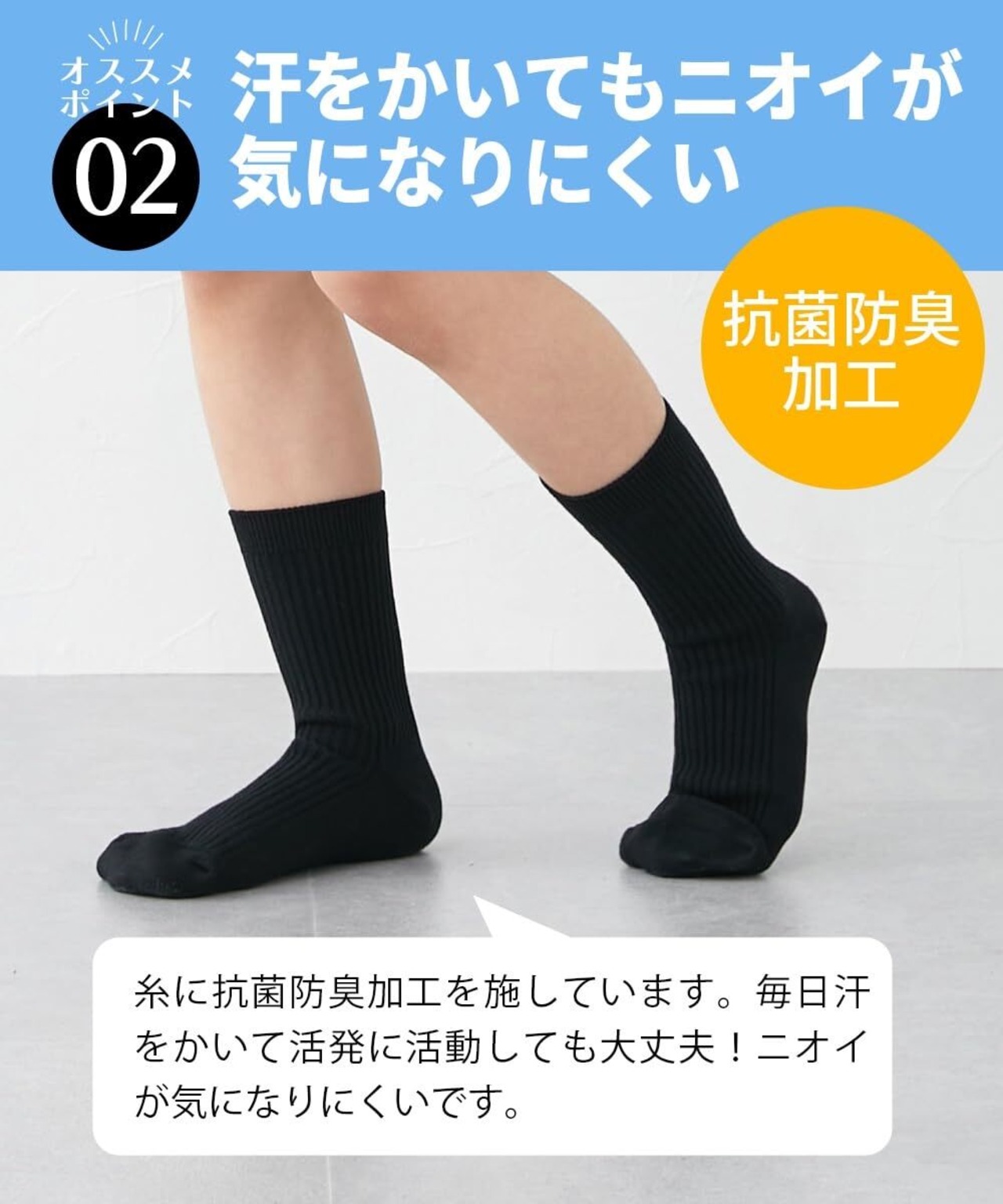 【抗菌防臭機能で毎日清潔!】特別な抗菌防臭加工が施されているので、毎日の使用でも安心です。元気いっぱいの子どもたちが活動する中でも、いつも快適に足元を保つことができます。特に通学や体育の授業にもぴったりです。