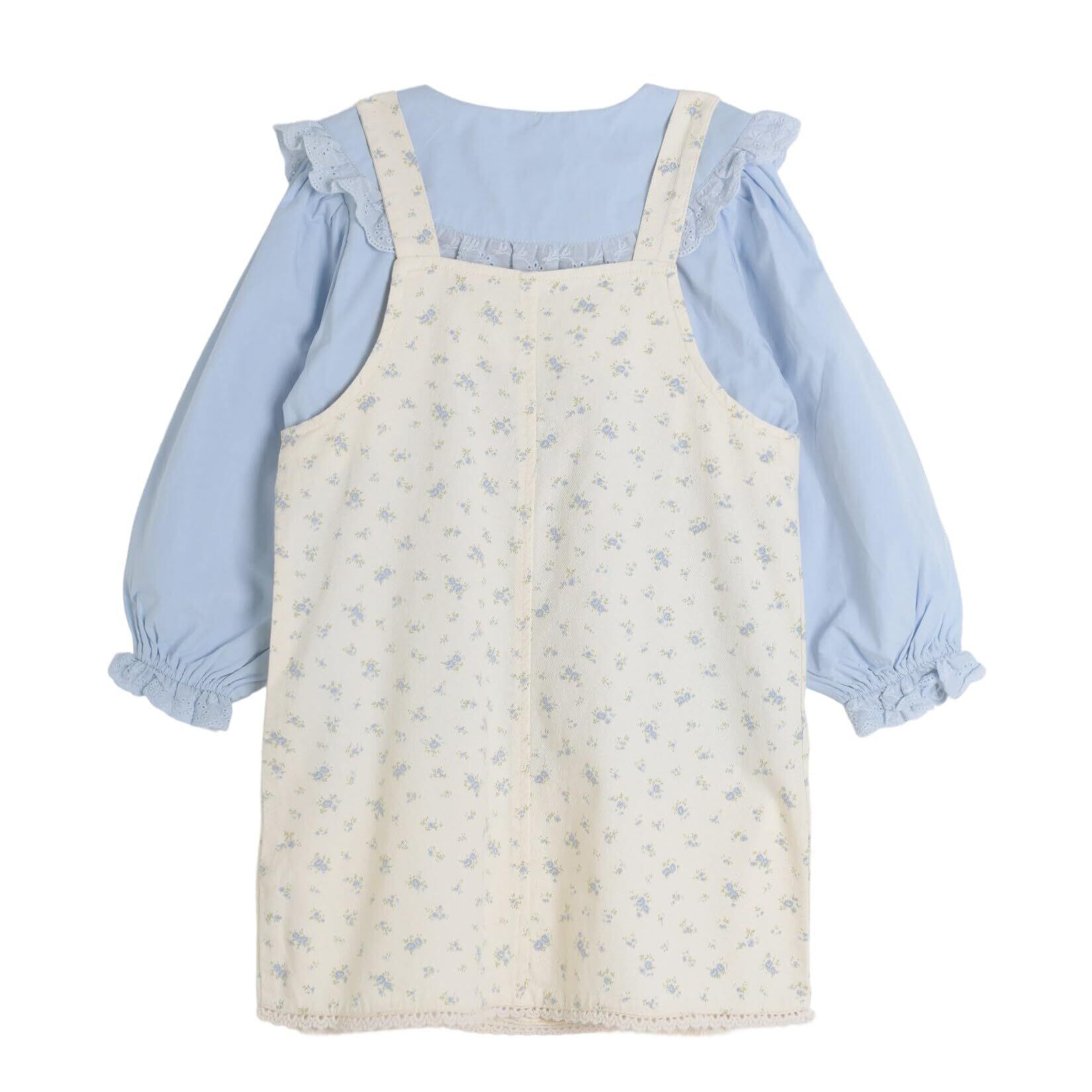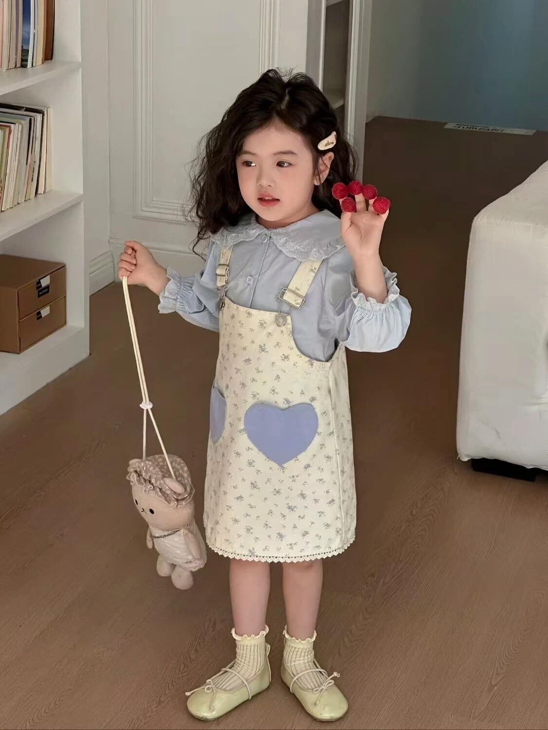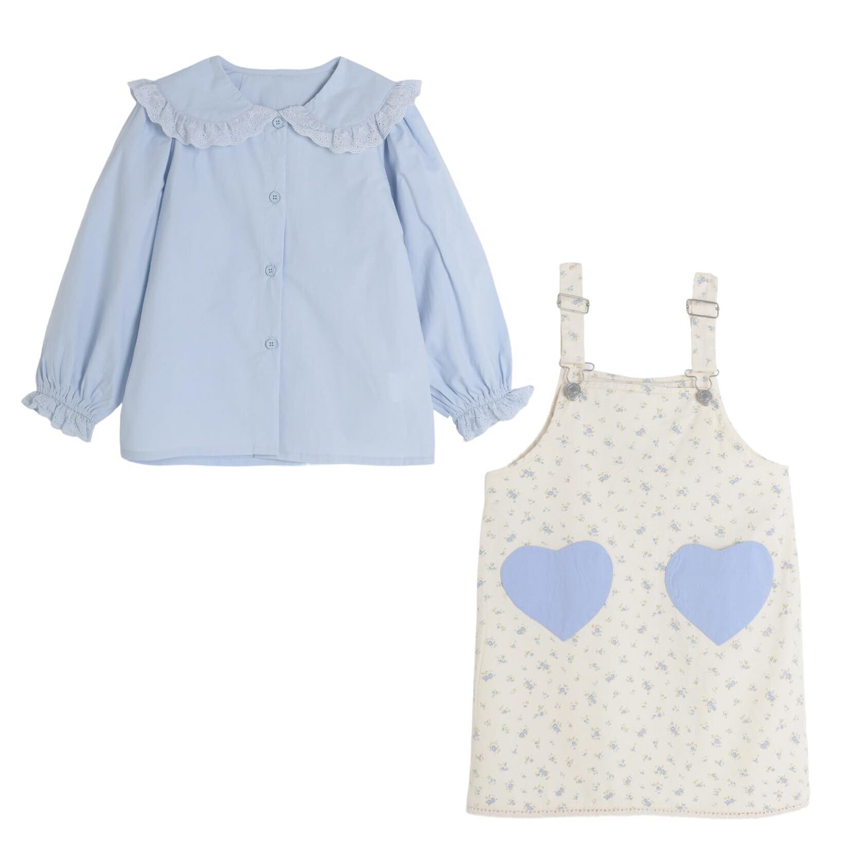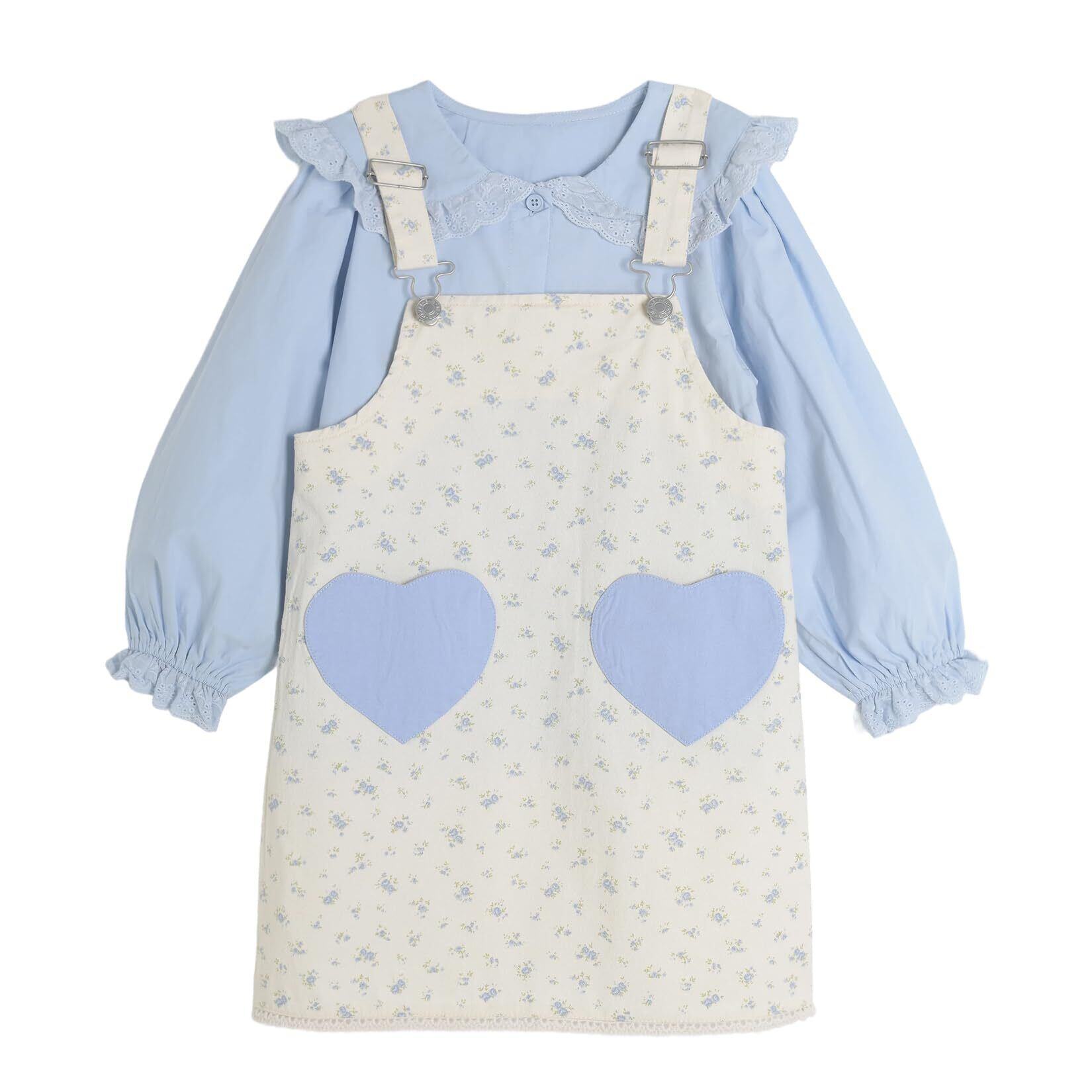 [LSMUDKINGDOM] セットアップ キッズ 女の子 ブラウス サスペンダースカート かわいい 花柄 レース フリル ハート 子供用 春