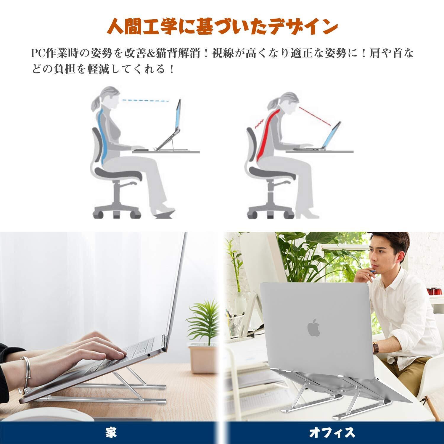 【人間工学設計&6段階高さ調節可能】ノートパソコンスタンドは人間工学デザインにより、視線が高くなり適正な姿勢に、肩や腰や首など負担を軽減してくれて、猫背などを有効に防止できます。長時間のPC作業時に傾斜角度15°~40°の6段階を調整可能、自身に合わせて最適な姿勢で気楽に仕事場を作り、デスクワークがもっと快適になります。