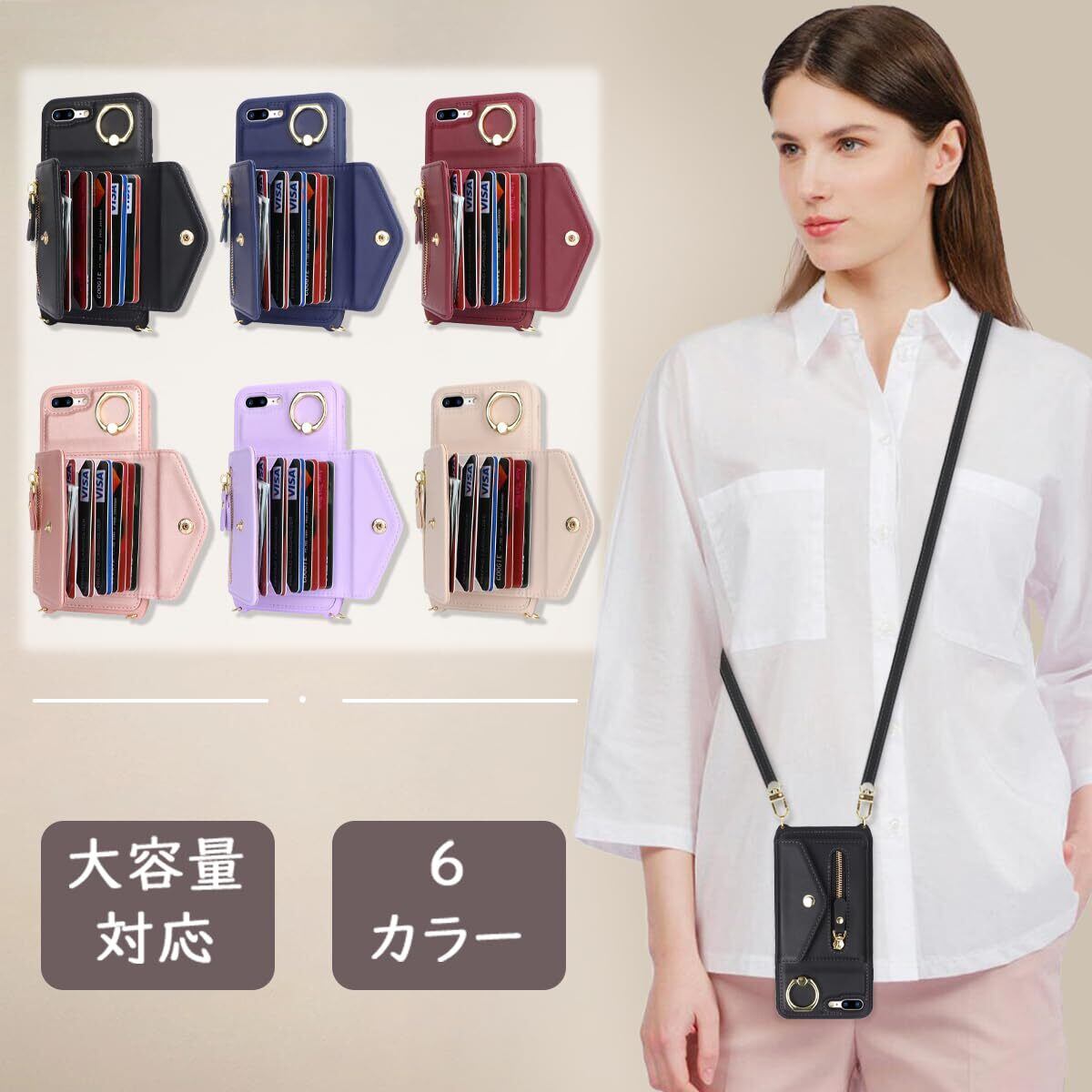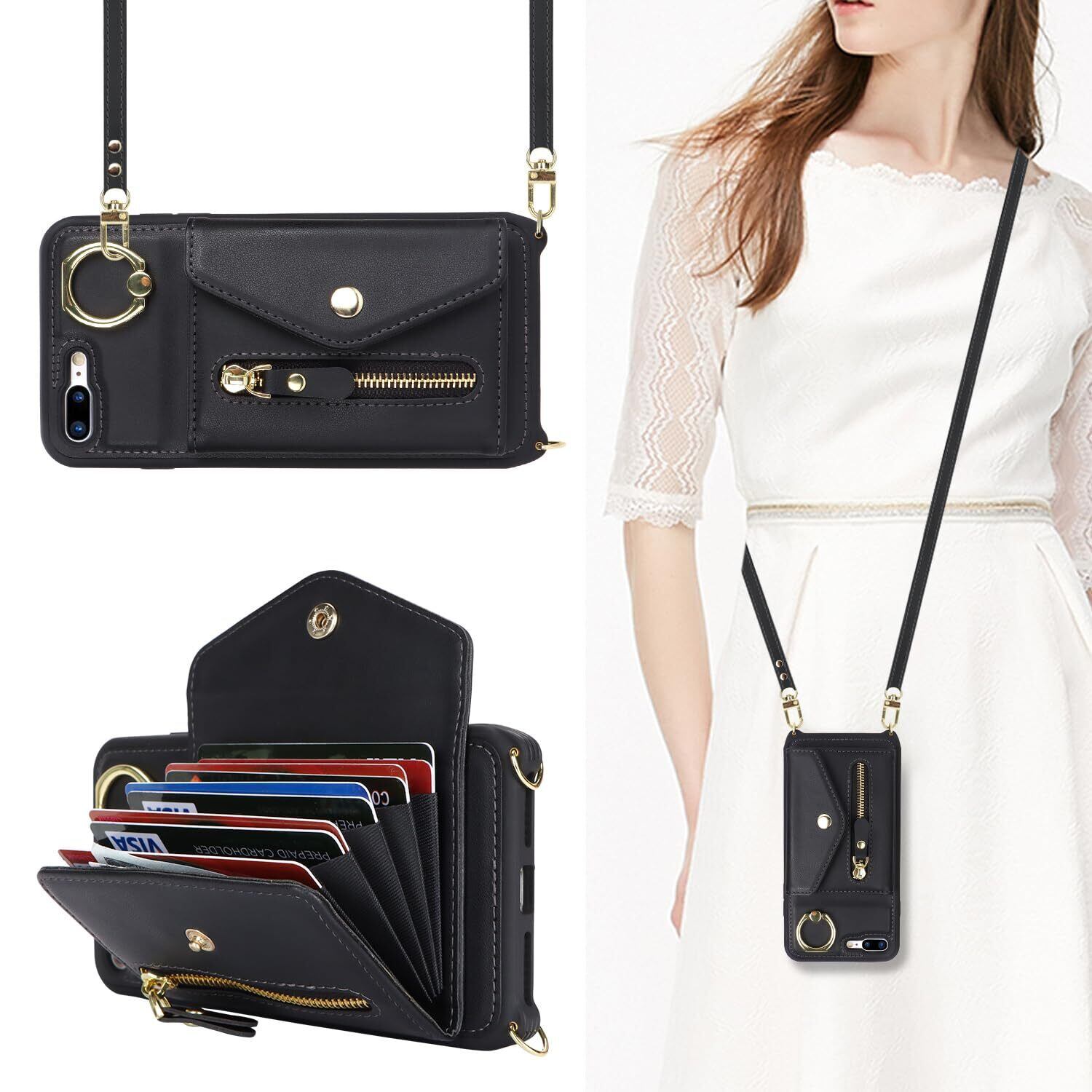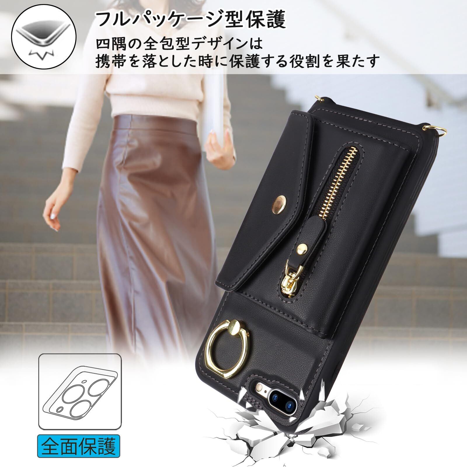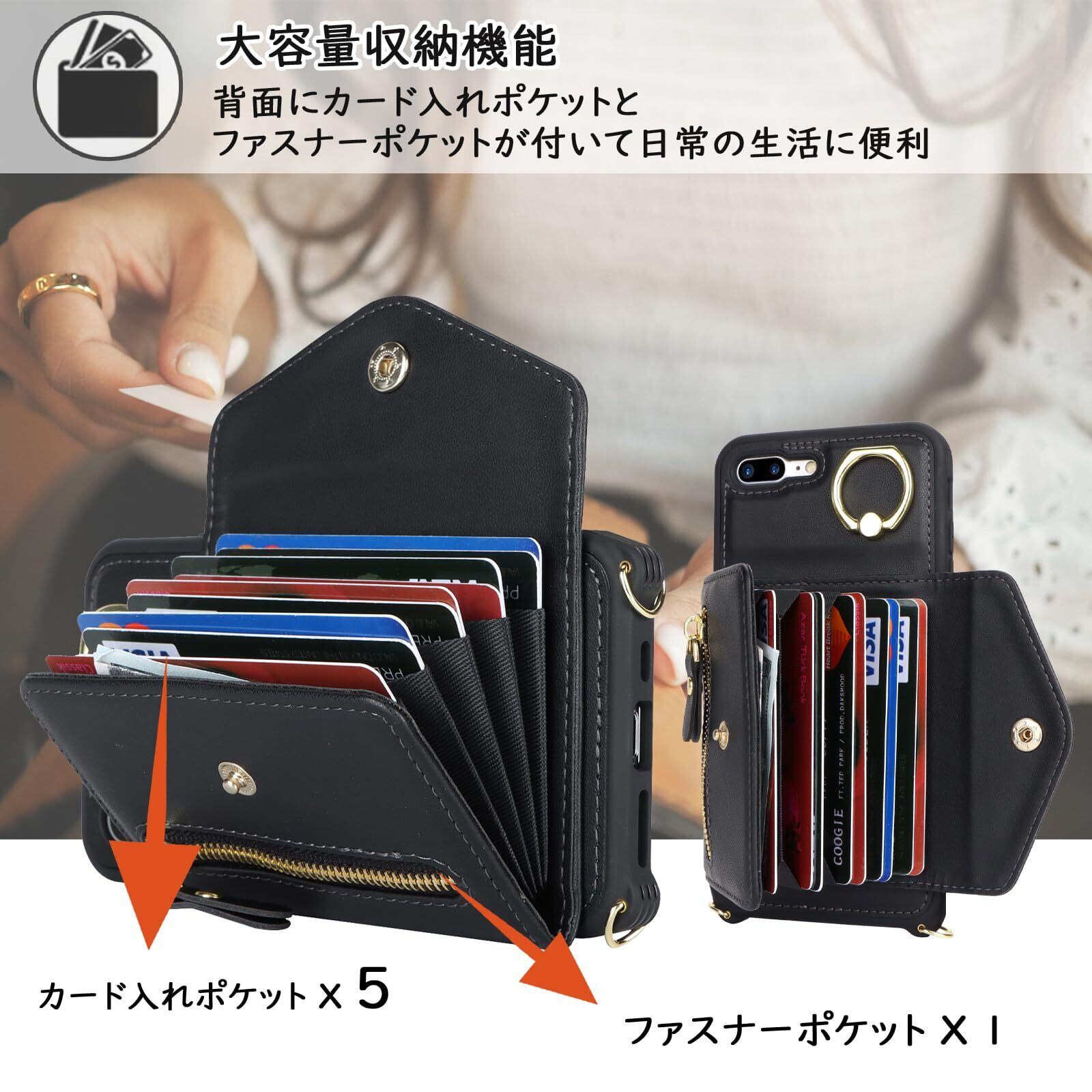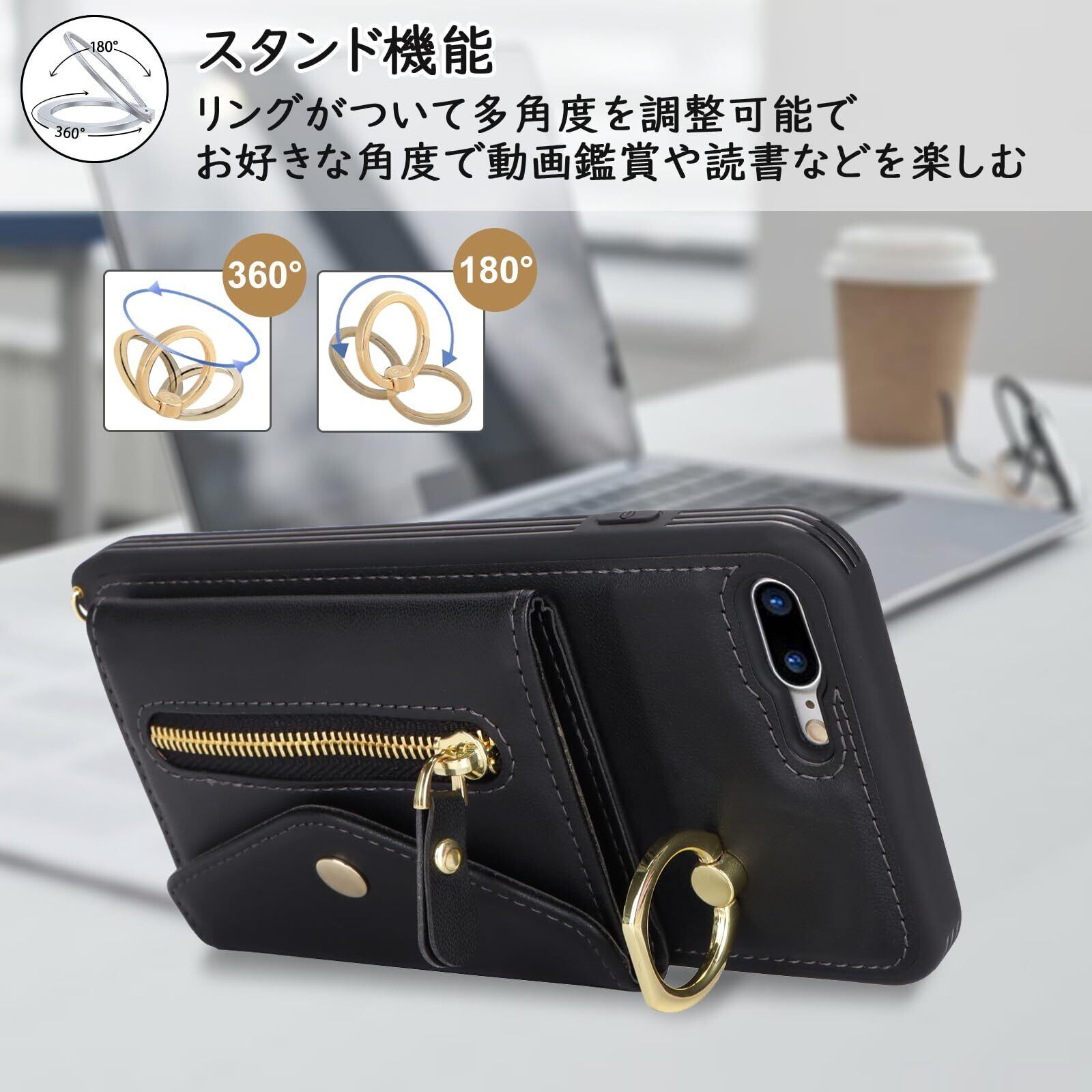 【新着商品】【Hamany】 対応 iPhone 8 plus ケース スマホ ショルダー iphone 7 plus ケース 手帳型 ショルダー おしゃれ カード収納 大容量 背面 リング付き スタンド機能 アイフォン8プラス ケース 耐衝撃 耐久性 女性 肩がけ 首掛け 斜め掛け ストラップ付き 長さ調整可能 カバー -ブラック