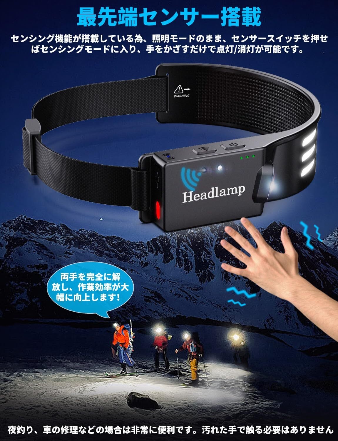 【手振りセンサー機能付きで便利!】このヘッドライトは手振りセンサー機能を搭載しており、点灯や消灯を簡単に行うことができます。両手がふさがっている時でも、簡単に操作できるのが大きな魅力です。