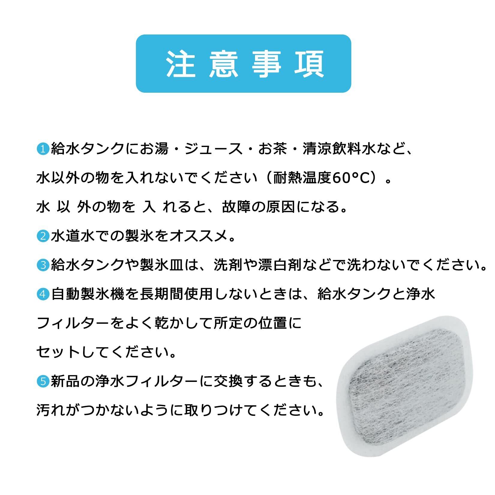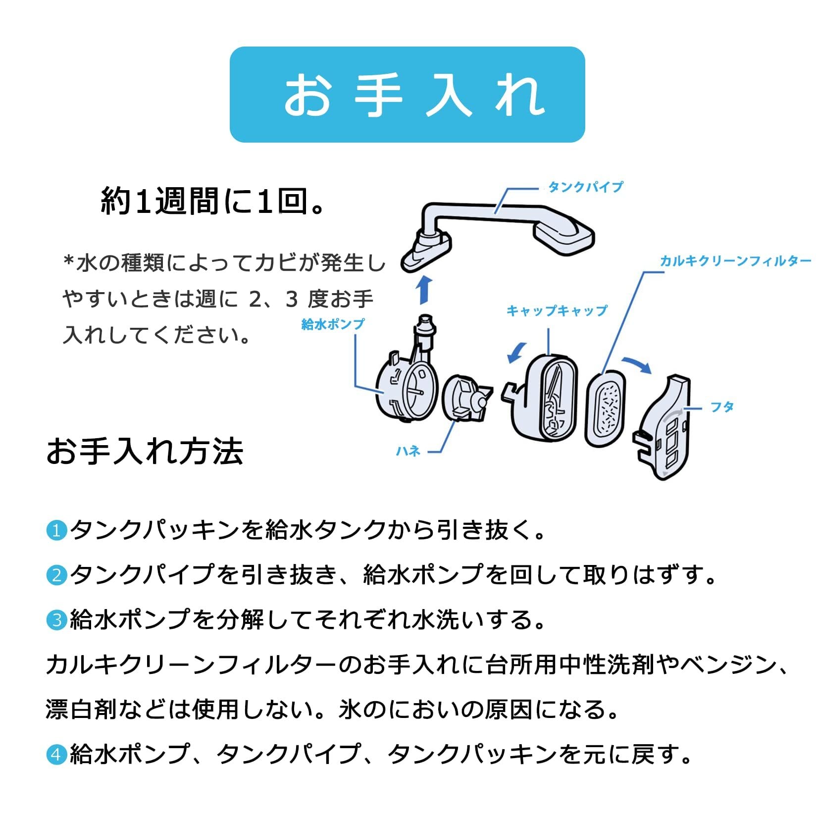 【お手入れ目安】1週間に1回。水の種類によってカビが発生しやすいときは週に 2、3 度お手入れしてください。浄水フィルターに水あかなどが詰まっていると製氷できないことがあります。