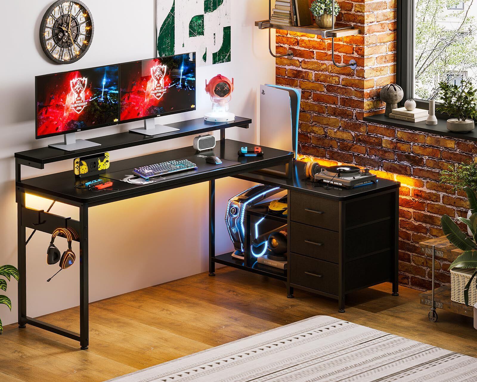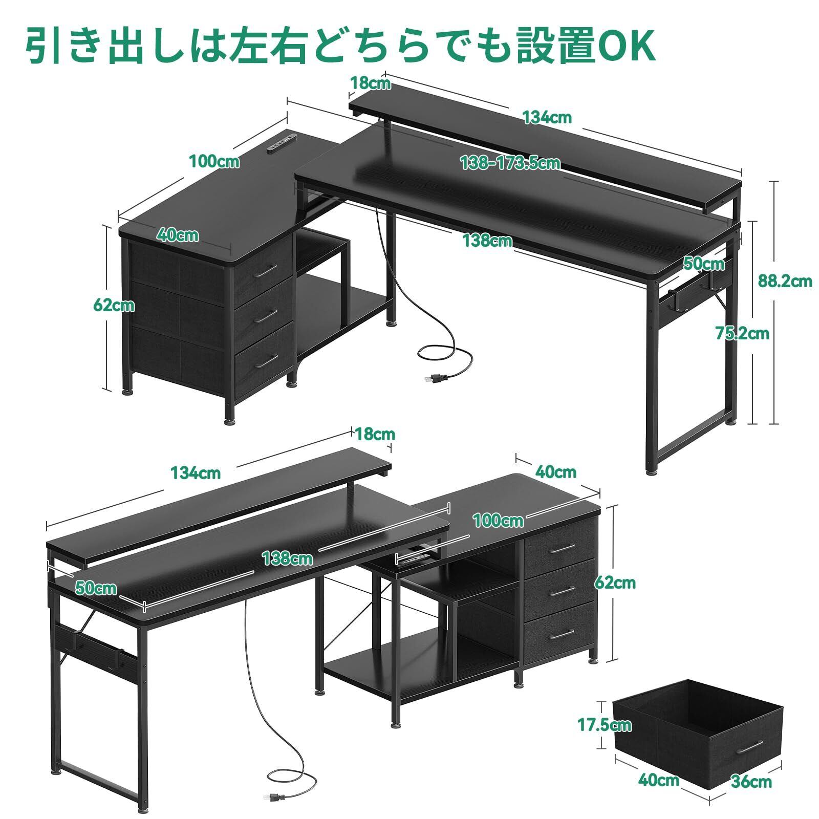 【コンセント付きデスク・ゲームと仕事両立】パソコンデスクとしてはもちろん、ゲーミングデスクとしても使用できるおしゃれなL字デスク。机には、2つのACコンセントとUSB ポート付きで、パソコンやスマホなどの充電ができて超便利です。また、引き出しは間取りや利き手に合わせて左右付け替え可能。