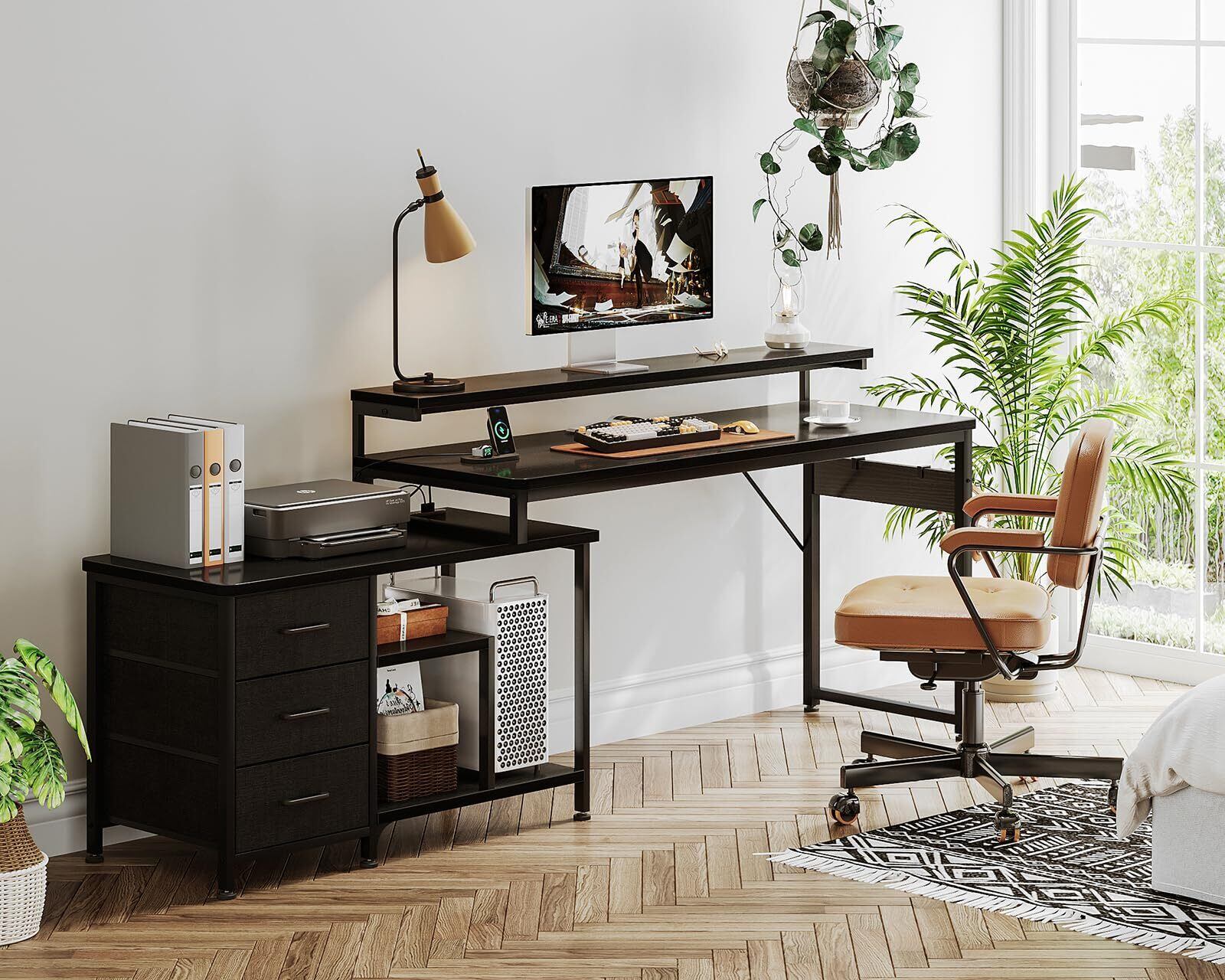 【引き出し付きデスク・収納力満載】デスクの足元には一体型の引き出しとラックが備え、本や書類などを使いたい時にサッと取り出せ、PC本体も楽に置けます。たっぷりの収納でデスク周りをスッキリ快適に!また、L字型のデザインで部屋のコーナーを最大限に活用し、ご家庭でもオフィスでも、日常の仕事に十分なスペースを確保できます。